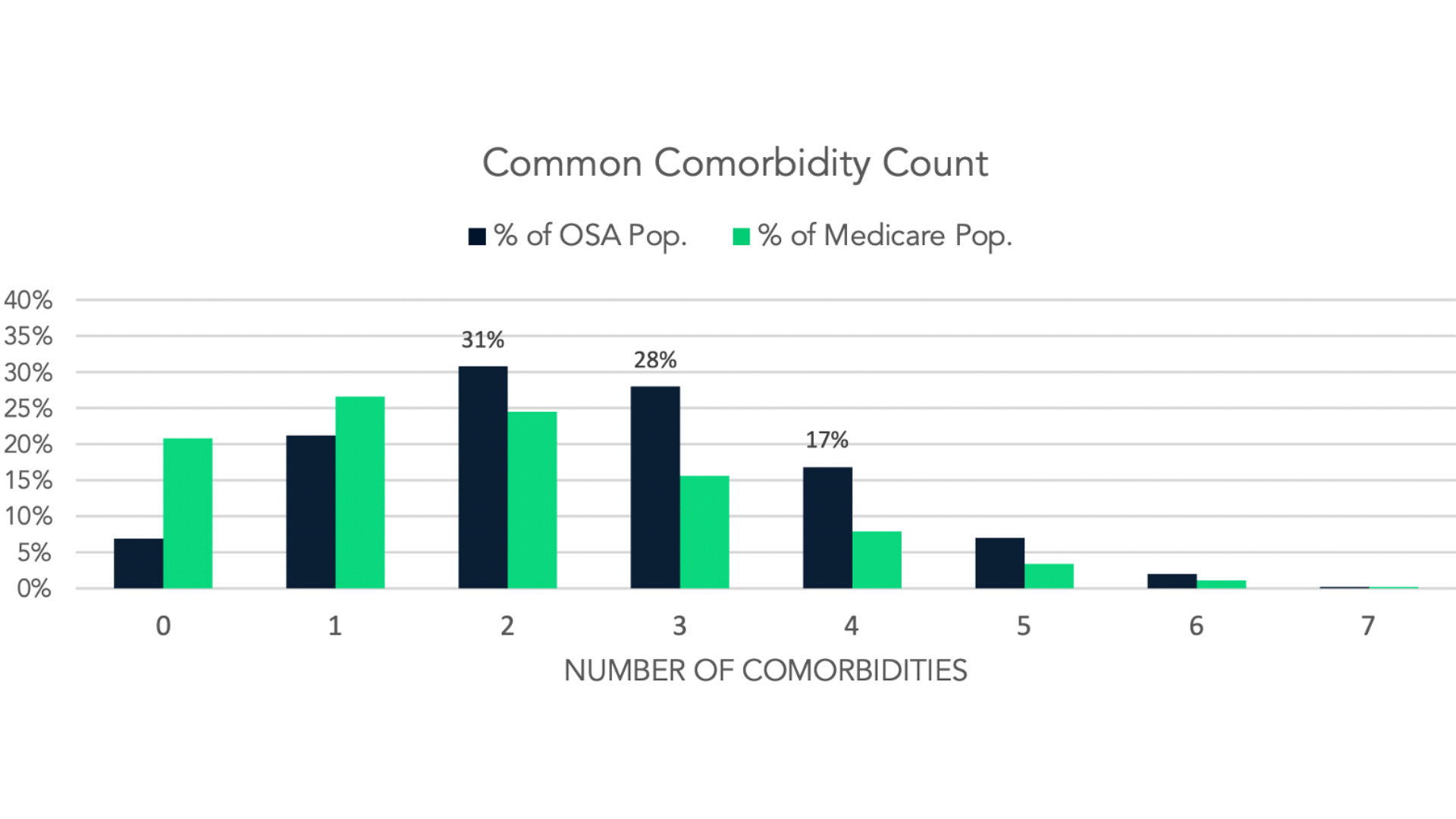 As you can see in the next graph, patients with 2-4 comorbidities account for 76% of the OSA population whereas in the baseline population members with 2-4 comorbidities only account for 48%.