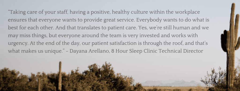 When asked what helps 8 Hour rise above the other sleep clinics, Arellano stressed patient care more than anything. “We are 100% about patient care, patient satisfaction, timeliness, and comfort,” said Arellano. “Everything we do is about our patients, 100% of the time.” You might ask, how does 8 Hour bring action to their words? Arellano mentions that having the best training and technology in place can make a world of difference. “Having been in sleep medicine for 20 years, I can say that this is the first time I’ve been at an organization where it is truly focused on leveraging cutting edge technology to provide better patient care,” Arellano said. “We also focus on highly trained staff. From day one, we have had a very defined training program for sleep technicians.” 8 Hour is committed to employing a well-educated and well-equipped staff in their centers. The combination of better resources, both in the sense of professional development opportunities and on-the-job tools, help make this a reality.How Dayana Got Started at 8 Hour
