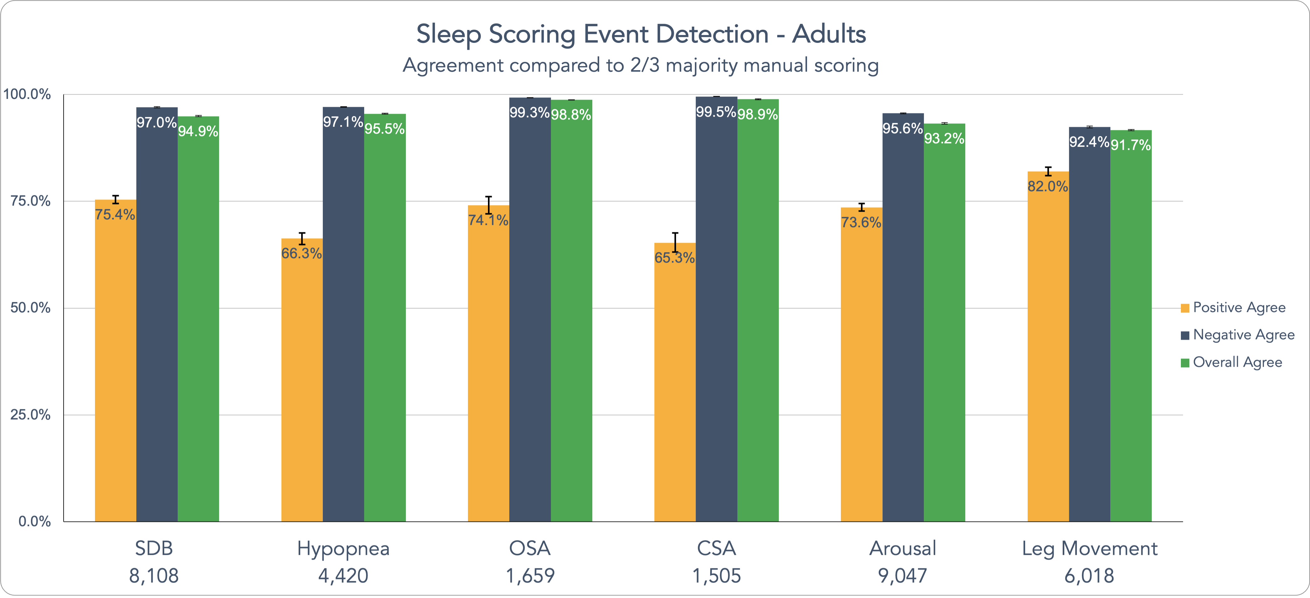 Beyond that, we share data on the latest sleep events our AI model can analyze including: improved sleep staging, OSA, CSA, hypopneas, arousals, limb movements, Cheyne-Stokes respiration, periodic breathing, atrial fibrillation, plus normative, mild, moderate, and severe OSA categories for global-AHI and REM-AHI, among other events. Let’s look at these metrics for our Adult data here on specific sleep scoring event detection: