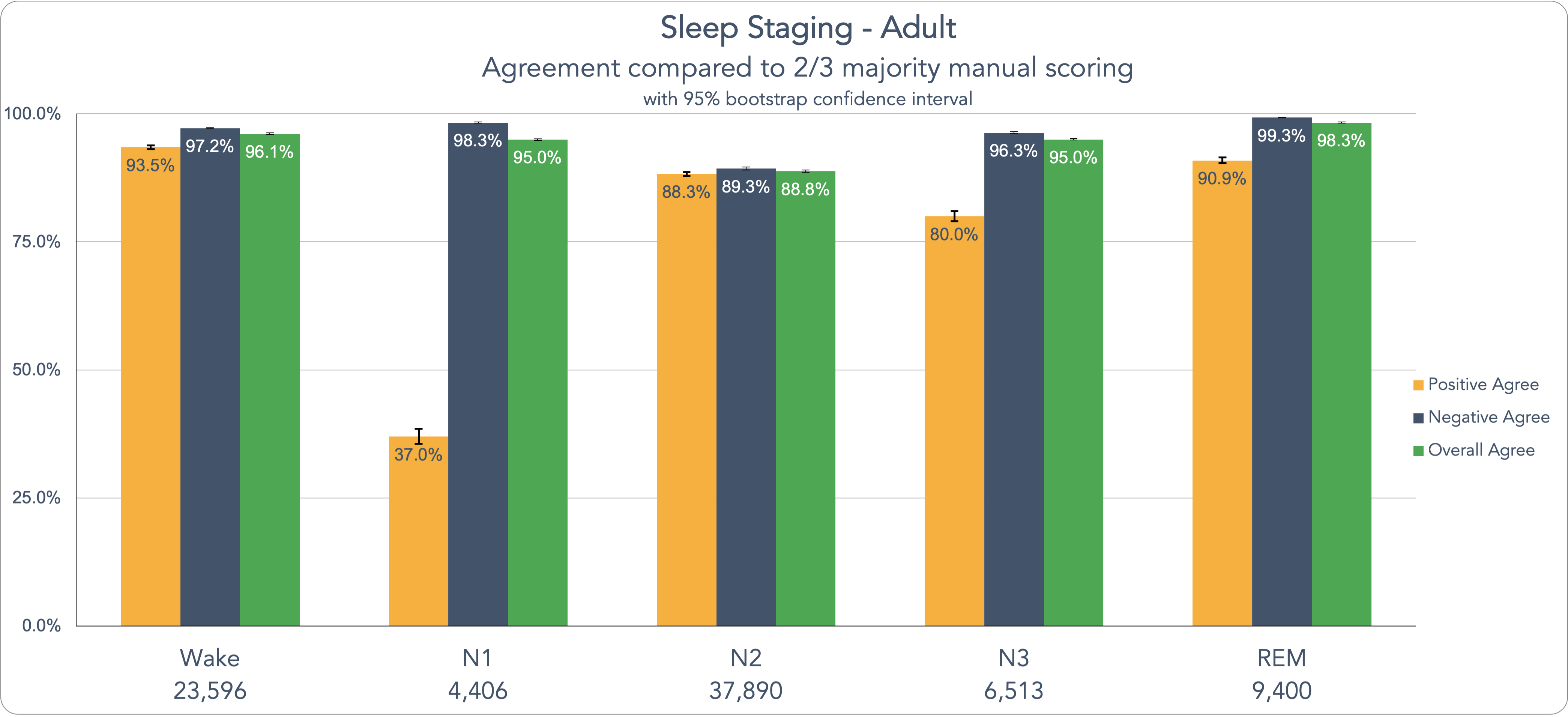 We would be crazy not to continue improving our AI sleep scoring solution, and while we don’t want to bore you with numbers, this is that point in the adventure. In our “Clinical Validation of AI Scoring in Adult and Pediatric Clinical PSG Samples Compared to Prospective, Double-Blind Scoring Panel” study, our team sought to set a new standard for AI-assisted sleep scoring and staging. For many doubters, there is still not enough data validation on the ability of AI in sleep scoring. To that end, we conducted the largest ever study of AI’s ability to analyze sleep, which includes roughly 3 times more data points than the next largest sleep study of this kind, (that we can find – if we’re wrong, please let us know.) The dataset is also very diverse, with a wide variety of demographic differences, including age, gender, BMI, medical conditions, medications, and other characteristics. Using this massive data set, we put EnsoSleep to work. And the numbers speak for themselves. You can see in the table below, that the agreement levels are quite impressive.