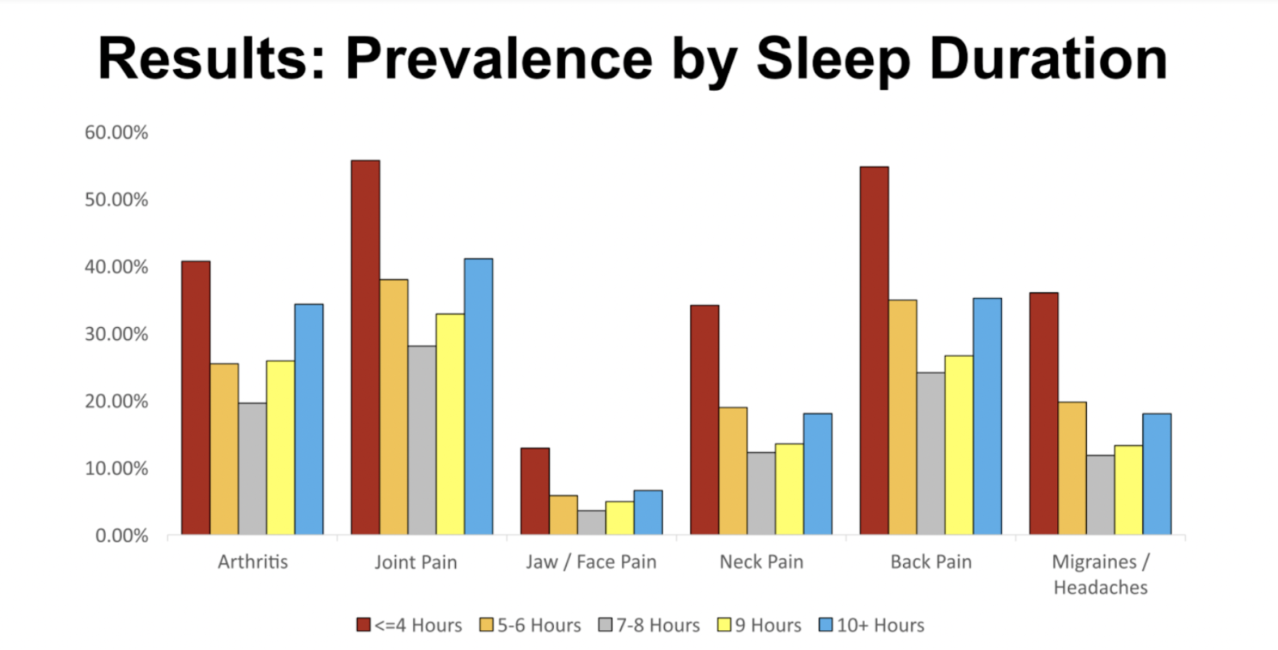 As you can see, there is significantly increased pain across the board for people who sleep less than 4 hours, and in all cases, getting 7-8 hours of sleep leads to the least amount of pain.