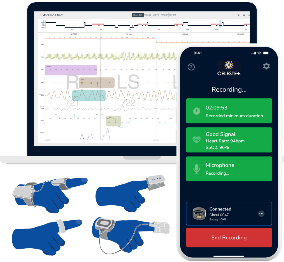 Celeste+ is a mobile app (Android and iOS) used to seamlessly collect and transfer data from pulse oximeters to EnsoSleep PPG.